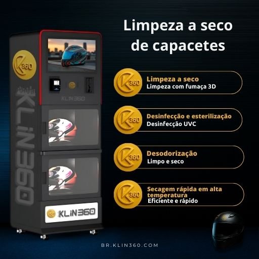 A Klin360 é a primeira rede automatizada do Brasil especializada em higienização de capacetes. Com tecnologia exclusiva de ozônio e UVC, a máquina limpa, desinfeta, esteriliza e perfuma em poucos minutos, sem químicos agressivos. Totalmente autônoma e monitorada por aplicativo, a Klin360 representa um negócio automatizado, rentável e de alta